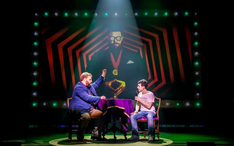 ‘From the comedic minds behind “The Play That Goes Wrong” and “Peter Pan Goes Wrong”’ boasts the poster. Featuring two of the original “Play Goes Wrong” creators – Henry Lewis and Jonathan Sayer, both accomplished and veteran go-wrongers, with impressive CVs of chucklesome achievements and each with an enviable comedic reputation. The stakes and standards are high. Will the expectations and the boasts be met? Add into the alluring mix a couple of familiar names from the world of sleight of hand – Penn and Teller, though neither are present, their influence is felt. A perfunctory sniff around the branding and website would suggest a comedy magic show with a dollop of mind-reading leading to, as they used to say in the Radio Times, hilarious consequences. “The Play That Goes Wrong” was a dazzling display of slapstick and invention – albeit a litany of variations on the same joke – which sustained and maintained its premise without straining the possibilities of what could plausibly go wrong. The follow-ups have been follow-ons rather than transcending the original – so what magic will be conjured up with this offering?