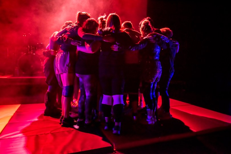 While the quality of storytelling is the highlight of the piece, the understated Bolivia-flag coloured mats (the importance of Bolivian culture becomes clear as you understand Jackson’s heritage) and musicality of the piece (no spoilers), provided by Isobel Odelola, heightens the energy and symbolism already very alive within the piece. The subtle lighting, designed by Sarah Readman, glides along nicely, without ever drawing attention to itself, giving us softer moments of the girl gang in a group hug. The piece also incorporates videography and digital captions, projected behind Jenni and the gang, which add a superfluous rhythm to an already brilliant designed show.
