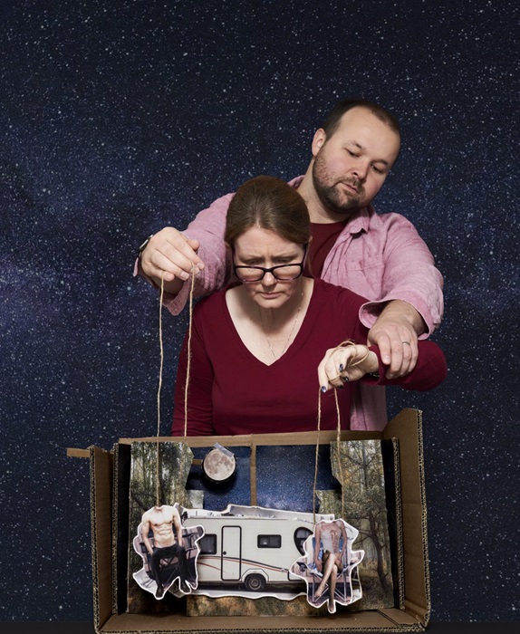 Tonight, I entered the intimate studio to a scene that showed a messy area of clothes, tippled-over chairs and strewn bottles of water. A couple were in the space looking frantic and tense and the woman was constantly checking her phone. The couple were arguing about whether the show should go ahead as the main female cast member had not attended. The man stated that the female had to step in and although she initially refused, she played the second cast member. The female cast member Helen Millington, (who directed the play) under duress, agrees to play the part of Crystal (a sex worker) – and as the music of the House Martins “Caravan of love” wanes after playing on a loop, the play commences. The male cast member played by Helen’s real life husband Alexander (who wrote the play) , explains to the small audience the plays’ plot.