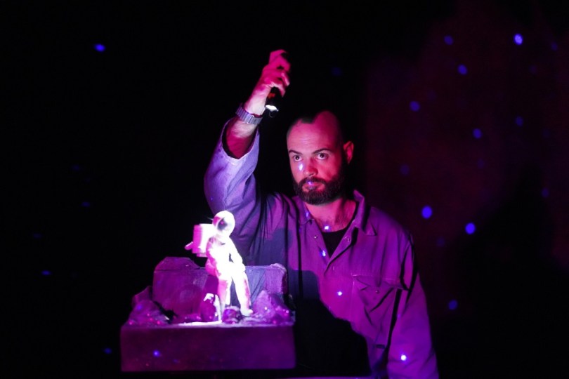 A multi-media setup enhances the experience, with the ads playing for the audience. These are bitingly sharp, very funny, and scarily convincing—so much so that it’s easy to believe Amazon and the government might actually mandate such intrusive advertising. The visuals match the “official” style perfectly, offering a chilling glimpse into a dystopian future. During one of the stories, as we follow an astronaut stranded on a distant asteroid, her oxygen running low, Head uses a beautifully crafted puppet, illuminating it with a handheld torch, to tell her story creating a haunting and intimate scene. There is really impressive video and design work throughout this production.