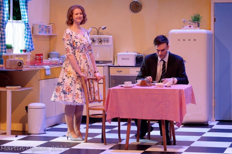 Opening night for Home, I’m Darling at the divine Altrincham Garrick Playhouse and the audience are presented with a phenomenal set (designed by Charlotte Leigh) of a beautiful 1950’s inspired interior. The stairs, centrally placed, lead up to a simple bedroom, painted in hot pink. Downstairs, on the one side, the yellow kitchen (with a superb Smeg refrigerator) and monochrome chequered floor, on the other, a green living room complete with a 1950’s fireplace and minibar! The set construction team (with Mandy Cooke as Scenic Artist) have excelled in the creation of this authentic looking abode.