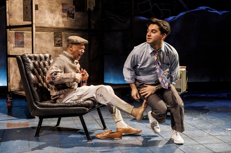 Omar is played by Lucca Chadwick-Patel and Johnny by Sam Mitchell. They are clearly opposites at the start, and you do want them to become a couple, even though a lot of the time it does feel slightly awkward or shoehorned into the plot. Chadwick-Patel’s Omar is clearly driven when he gets his first opportunity from his Uncle Nasser (Kammy Darweish). Darweish portrays what we would probably class as a stereotypical Asian Uncle, living life in the UK and trying to earn an honest living with all of his business. As his secondary relationship breaks down, we get to see a different side of the character, and both are portrayed excellently. Hareet Deol as Salim is smarmy, self-important and completely full of himself, as the character requires. It is obvious from the start that he is one of the antagonists of the play. The other main antagonist is Paddy Daly as Genghis. Towards the end of act two, Daly is so into his character, that even sitting in the audience felt uncomfortable and scary with how he was acting. It was a relief seeing him smile at the bows and not seem at all as fascist and racist as his main character. Emma Bown as Rachel and Moose was clever in disguising herself between the two characters and watching the relationship appear between her Rachel and Tania (Sharan Phull) was engaging to watch. Gordon Warnecke as Papa felt a bit unsure in the role, which was a slight disappointment after learning he was Omar in the 1985 film.