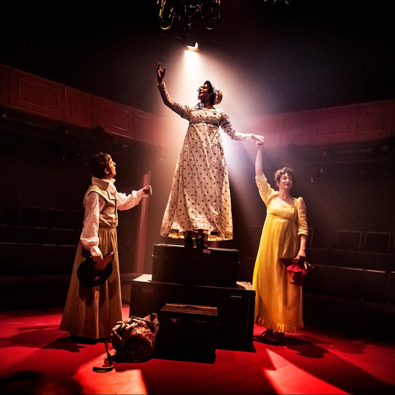 Subverting Austen’s own omniscient narrator, we hear the story from the perspective of Cath (Rebecca Banatvala), reenacting her life and recent adventures with Iz (AK Golding) and Hen (Sam Newton) directly to the audience. Cath is a romantic heroine in her own mind, prone to flights of fancy and desires her story to be passionate, enchanting and idyllic, marrying Henry Tilney and living happily ever after. However, Iz offers an alternative view of events, queering the narrative to develop the relationship between the two young women as a new love story sitting within the existing structure.