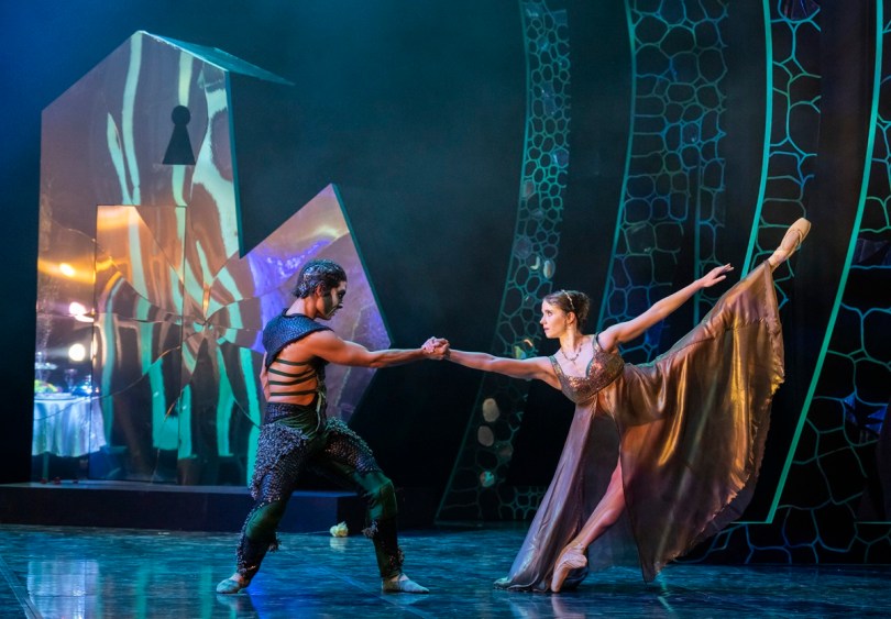 As always, the supporting cast is top class, and none more than Areys Merill and Harriet Marden’s witty dancing playing Beauty’s materialistic sisters as Nixon takes on capitalism.  The scene where sisters preen with their vacuous friends only concerned with their finery and what they can buy is great fun, before a huge removal van appears on stage to whisk Beauty’s family away to penury. The hugely experienced Dominique Larose and Abigail Prudames are nicely mysterious as warring good and evil fairies. Special mention to Albert Gonzalez Orts, Jin Ishil, Araon Ko and Yu Wakizuka who are great fun as the cavorting castle Goblins.