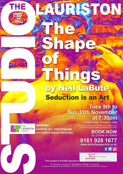 Over in the Lauriston studio theatre Neil LaBute’s The Shape of Things will play from Tuesday 9th – Sunday 11th November at 7:30pm.