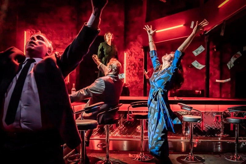 The set by Miriam Buether – a cross-shaped disco bar in neon-red light doubling as an antechamber of Hell and political puppeteering – feels so authentically Muscovite one could almost taste the mayonnaise-filled sushi’s just looking at it.