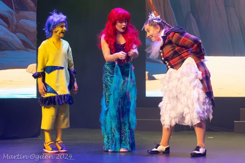 The costumes were awesome (Spotlight costumes) – giving each cast member a crustacean, fish or anemone to wear (wonderful! ), the choreography (Kirsten Dunn) was exquisite, the music (Simon Pickup) was (as always) magical , having us all sing along to the musical classics “ Under the Sea”, “Kiss the Girl” and “ Part of Your World” and the props and digital back drops, as stated, were transformational – stage manager (Paul Downham) transporting us from the glorious sea bed, to the dazzling coastline onto the magnificent Prince’s castle in a magical faultless way – likened to a dream world of Walt Disney himself – and it was fascinating how this was mastered on this stage in Runcorn – a work of genius!