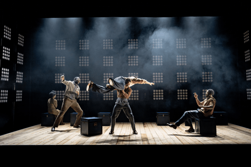 This production, which has transferred to the Kiln theatre after a very successful run at the Jermyn Street theatre is a mixture of theatre and movement. The eight strong cast worked very well as an ensemble with members of the cast not directly involved in the current scene either sitting on boxes at the back of the acting area or moving, often in slow motion and dreamlike sequences, around the action. There is no other stage furniture or scenery, but around the three sides of the acting area are large banks of coloured lights which periodically flash different colours and project different shapes. It was accompanied by a variety of engaging music and beautiful singing. It is a visual and audible feast.