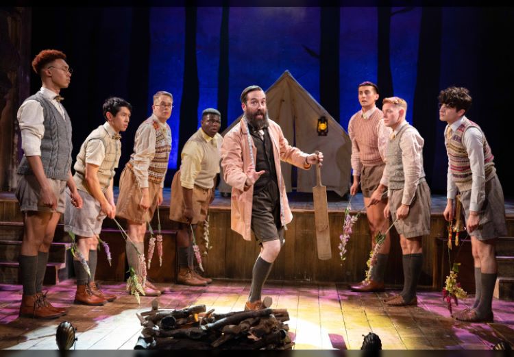 Regan has anglicised many of the characters’ names, while echoing their originals, so Nanki-Poo (the young suitor) becomes Bertie Hugh, Ko-Ko, the Lord High Executioner is now Cocoa, Yum-Yum is Violet Plumb and Pooh-Bah (the Lord High Everything Else) is now Albert Barr. The most delightful switch though is Katisha becoming Kitty Shaw. It makes it all sound very English village. This is in keeping with the production being set in a 1950s boy scout camp, the cast all in short trousers and Fairisle jumpers. It has a jolly, jamboree atmosphere. Ryan Dawson Laight’s stage design is simple but effective – one movable tent and a few boxes with a backdrop of trees, plus a campfire for toasting fake sausages and marshmallows.