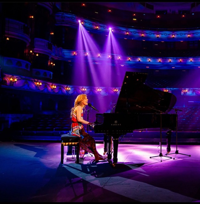 It remains a sad feeling to see any show broadcast from an empty space where an audience should be, however large or small. The beautiful Coliseum auditorium is lit up in reds, golds, and blues but without an audience there is a lack of energy and atmosphere. Janson, however, is a likeable and perceptive performer, and brings warmth to the stage alongside a stripped-down band. Her musical director Adam Dennis is on the piano, and Adam Goldsmith plays guitar. Together they conjure up a cosy, cabaret vibe despite the huge ranges of seating visible behind them.